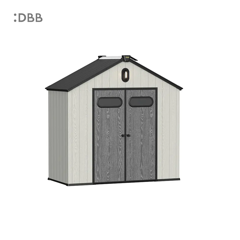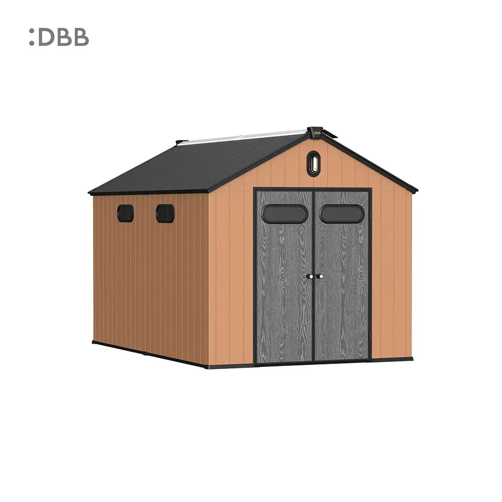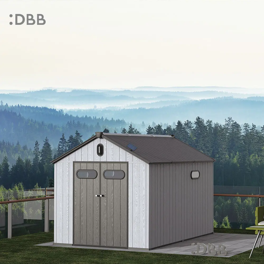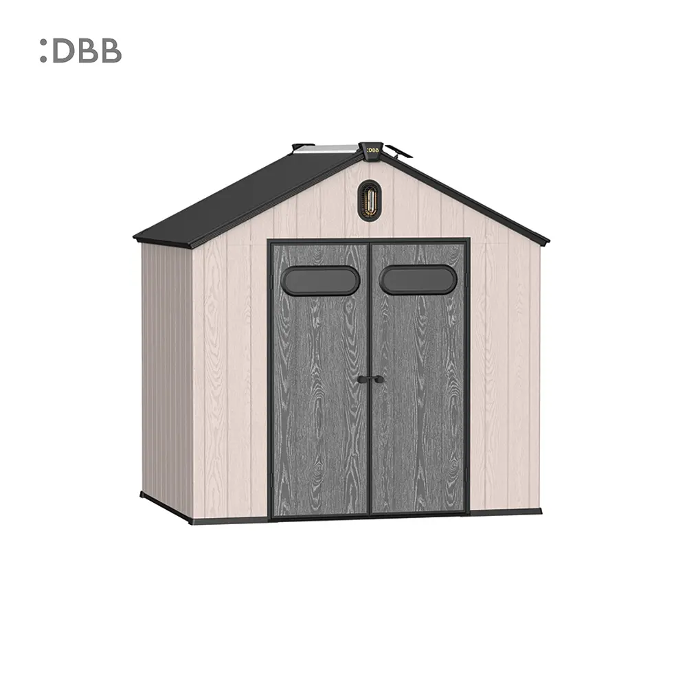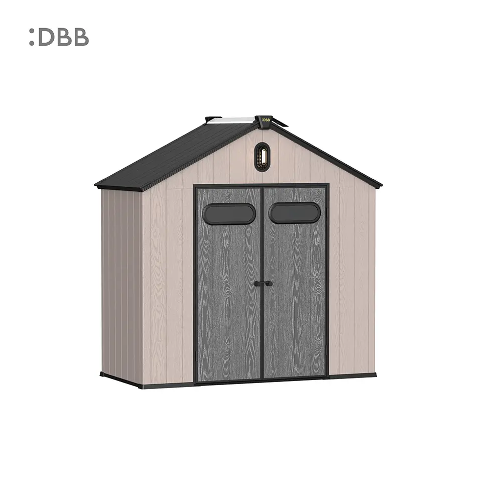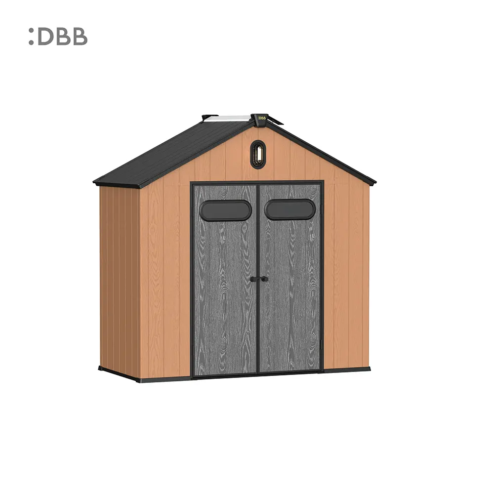 Tired of a messy yard or garden? You need a outdoor garden storage shed of DiBiBi, which is the result of the perfect combination of modern design and practicality, enough to meet your needs. The surface wood grain is beautiful and fresh, large storage space for lawn mowers, pool toys, bicycles, and other gardening tools. Skylight at the top allows in natural light, it also has an active ventilation system and lighting system. The combination of steel frame construction and thick resin panels allows the roof to withstand heavy snow loads. Not afraid of wind, rain and UV rays, resist rust, for your belongings to bring a full range of protection.