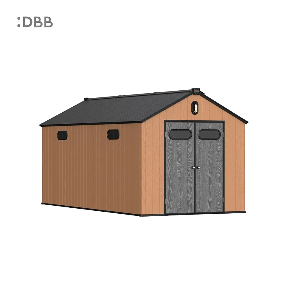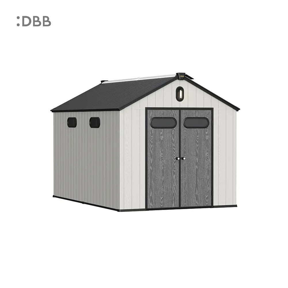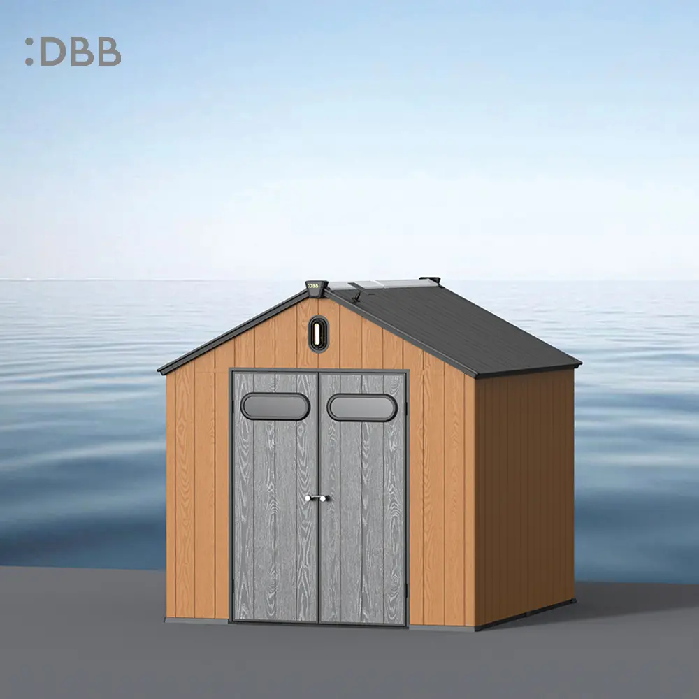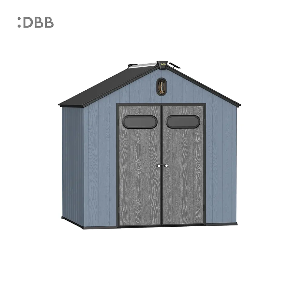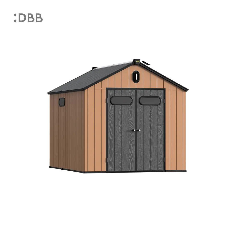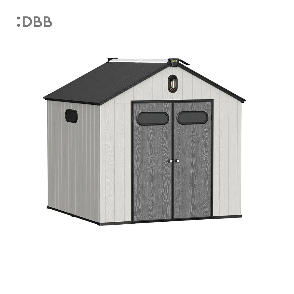 Tired of a messy yard or garden? You need a outdoor garden storage shed of DiBiBi, which is the result of the perfect combination of modern design and practicality, enough to meet your needs. The surface wood grain is beautiful and fresh, large storage space for lawn mowers, pool toys, bicycles, and other gardening tools. Skylight at the top allows in natural light, it also has an active ventilation system and lighting system. The combination of steel frame construction and thick resin panels allows the roof to withstand heavy snow loads. Not afraid of wind, rain and UV rays, resist rust, for your belongings to bring a full range of protection.