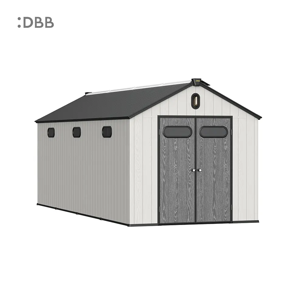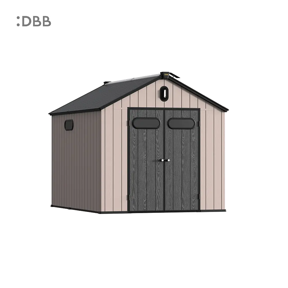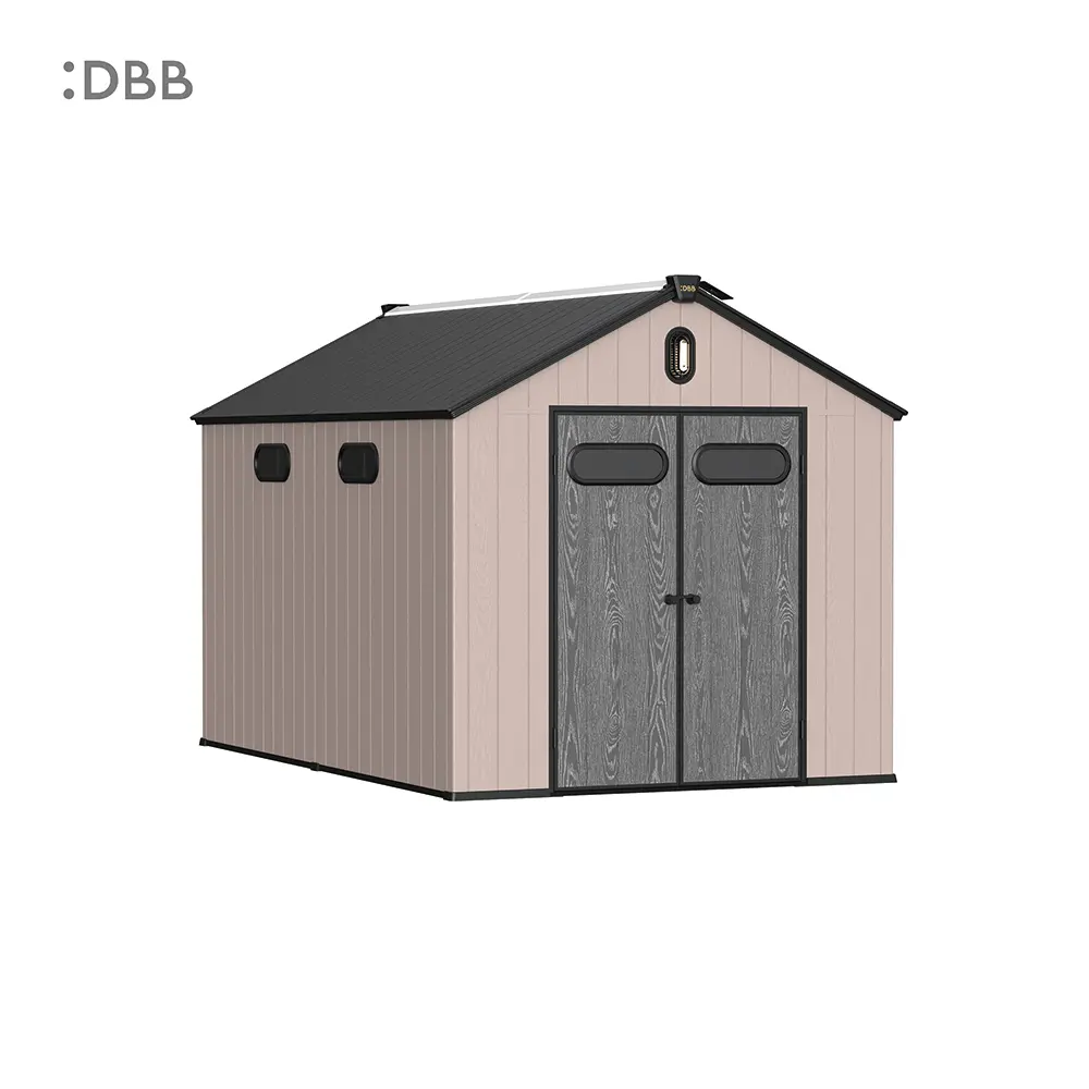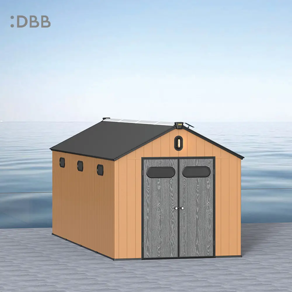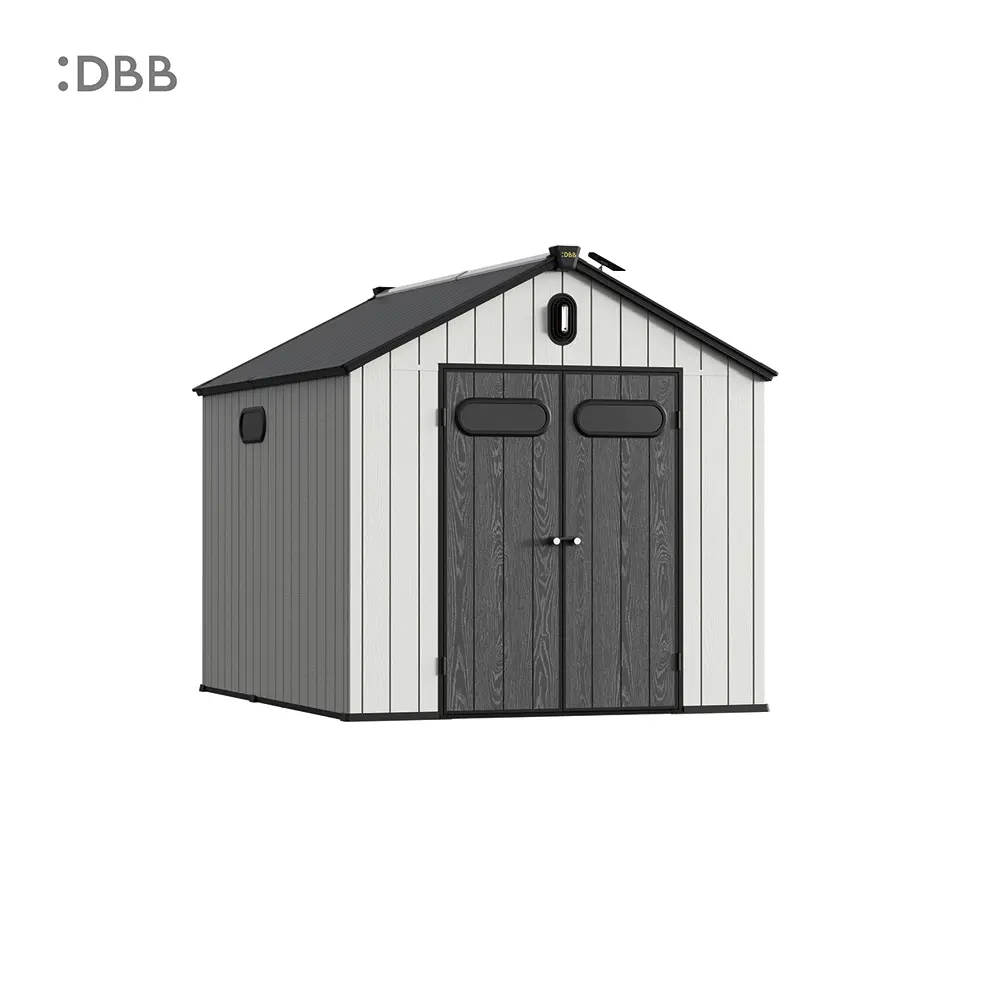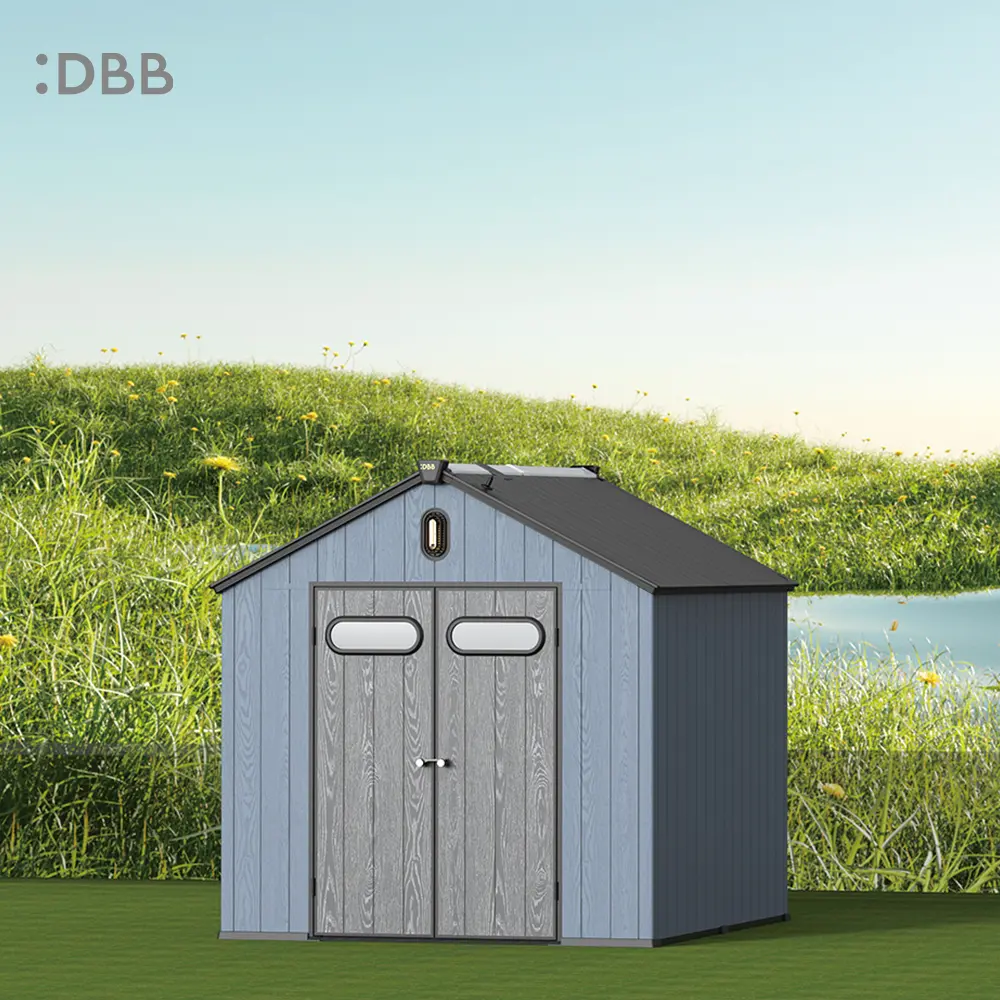 Tired of a messy yard or garden? You need a outdoor garden storage shed of DiBiBi, which is the result of the perfect combination of modern design and practicality, enough to meet your needs. The surface wood grain is beautiful and fresh, large storage space for lawn mowers, pool toys, bicycles, and other gardening tools. Skylight at the top allows in natural light, it also has an active ventilation system and lighting system. The combination of steel frame construction and thick resin panels allows the roof to withstand heavy snow loads. Not afraid of wind, rain and UV rays, resist rust, for your belongings to bring a full range of protection.