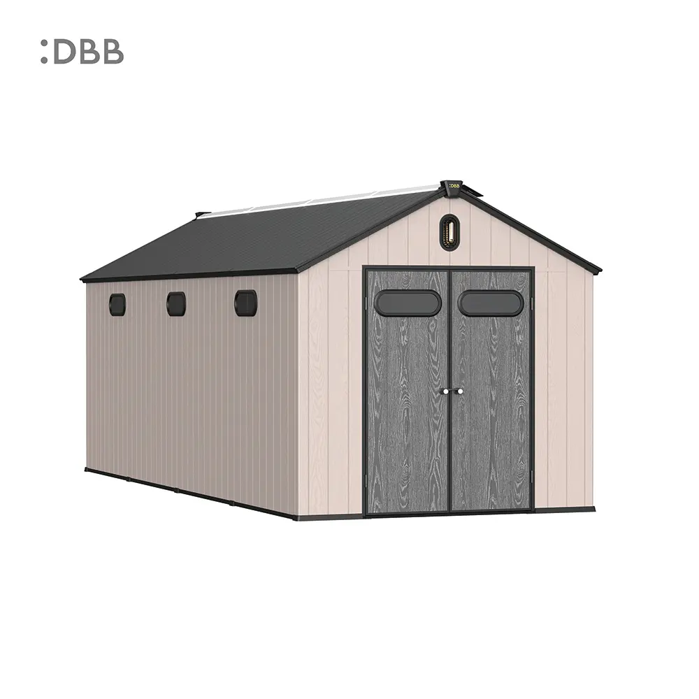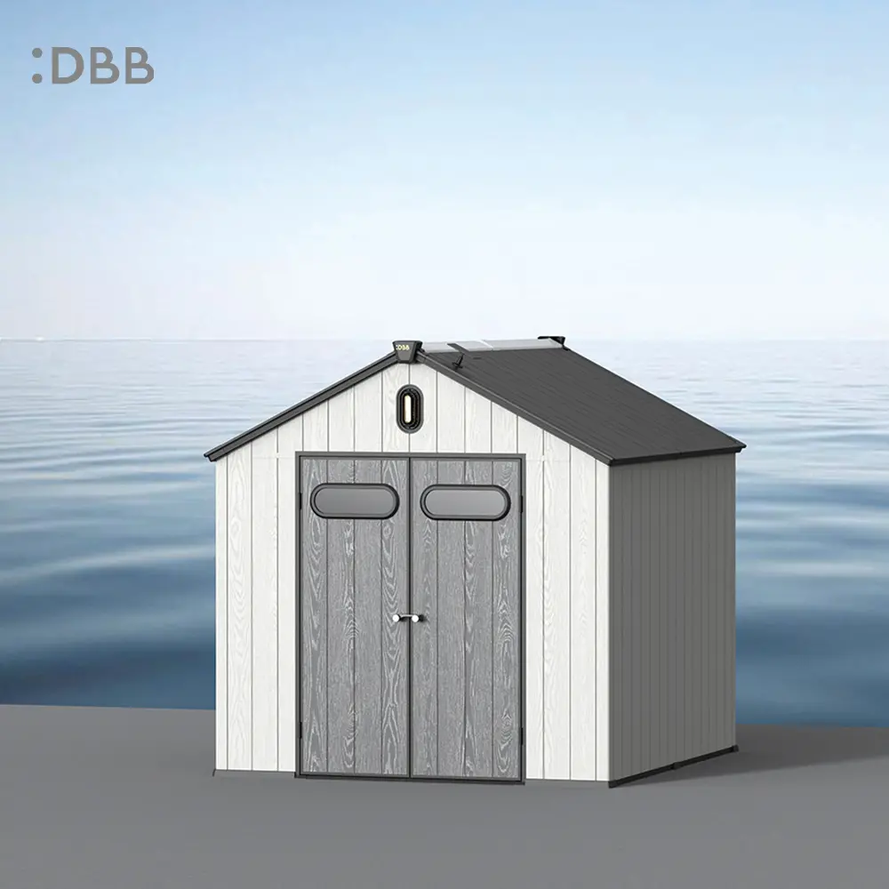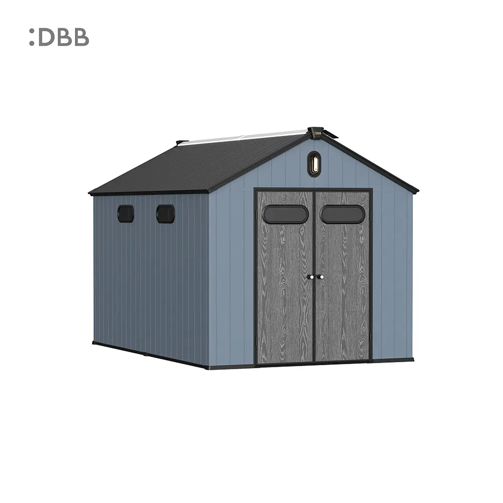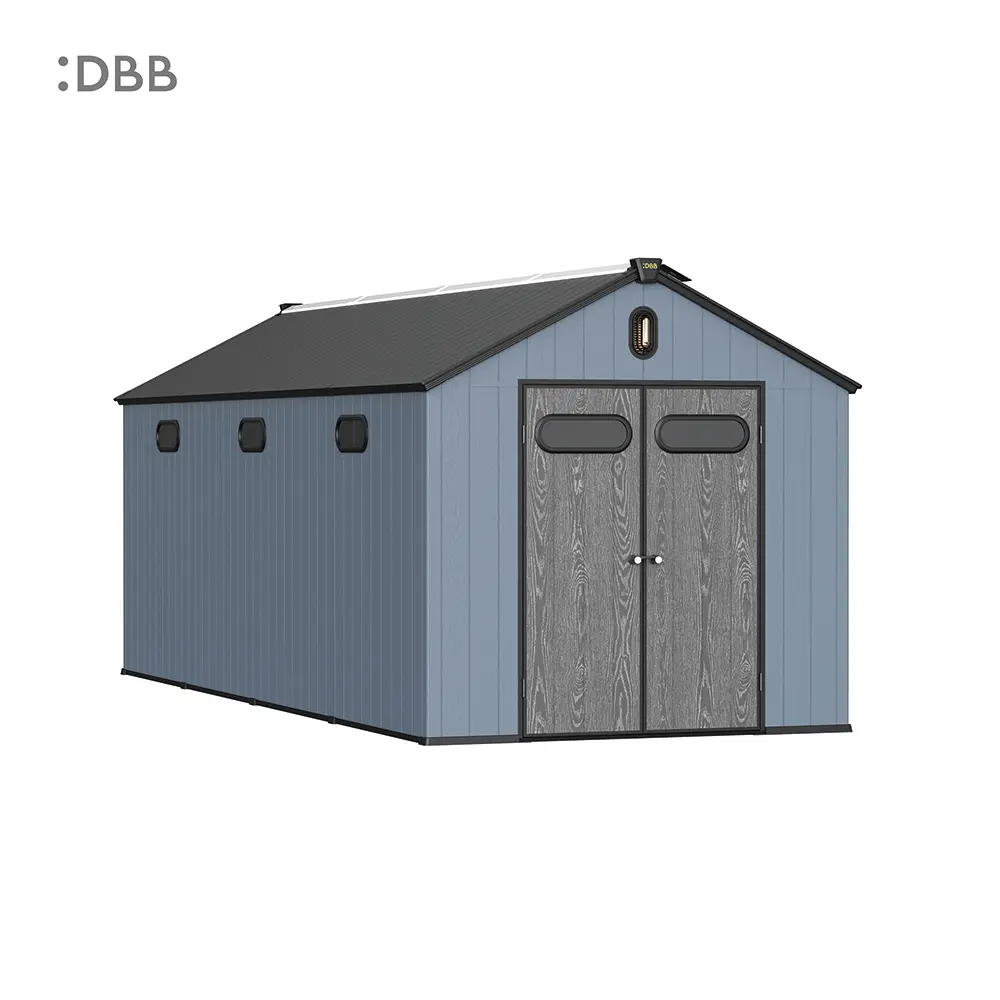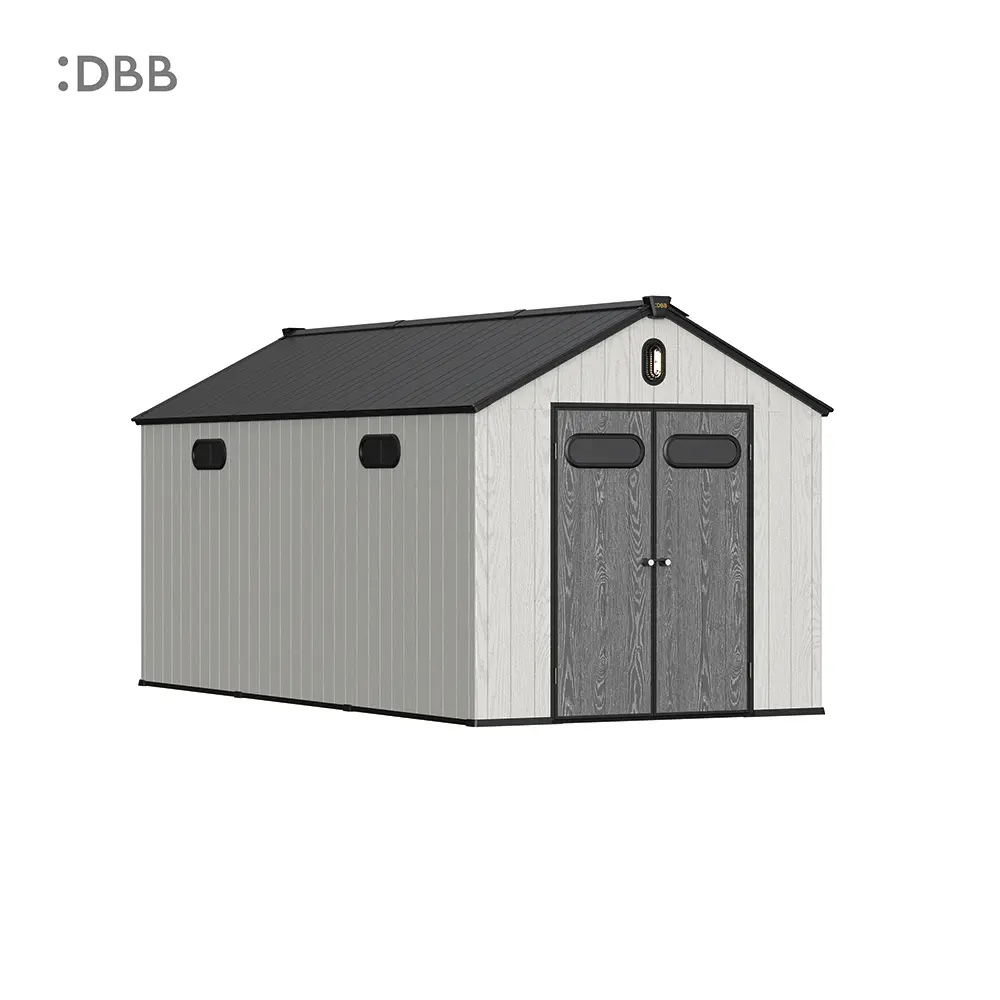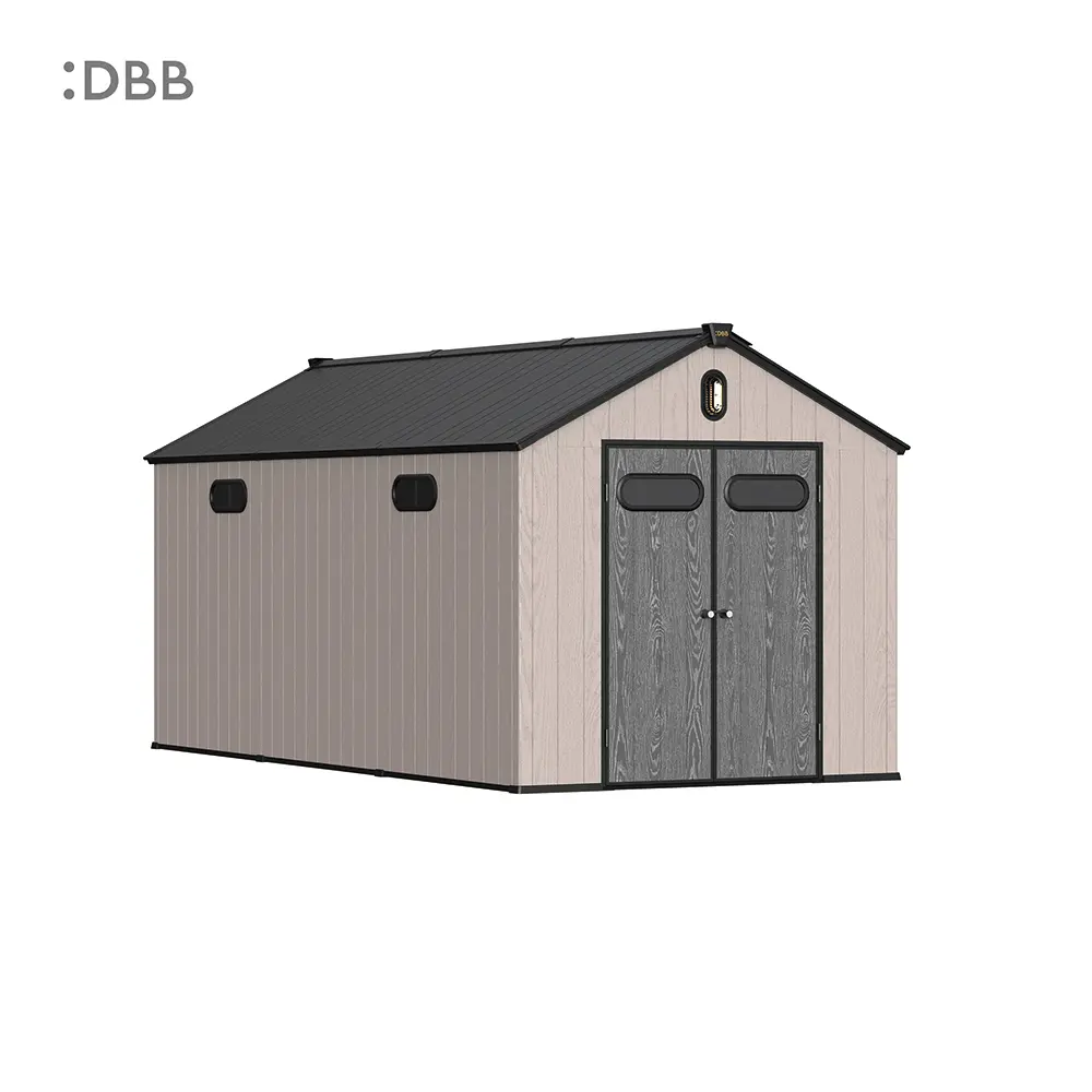 Tired of a messy yard or garden? You need a outdoor garden storage shed of DiBiBi, which is the result of the perfect combination of modern design and practicality, enough to meet your needs. The surface wood grain is beautiful and fresh, large storage space for lawn mowers, pool toys, bicycles, and other gardening tools. Skylight at the top allows in natural light, it also has an active ventilation system and lighting system. The combination of steel frame construction and thick resin panels allows the roof to withstand heavy snow loads. Not afraid of wind, rain and UV rays, resist rust, for your belongings to bring a full range of protection.
